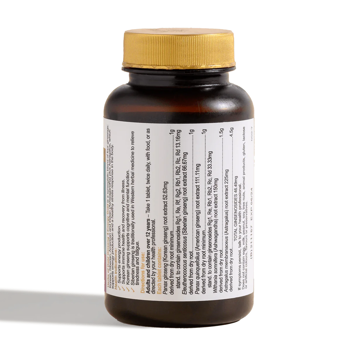 - Ginseng 4 Energy Gold 含有四种人参:韩国人参、西伯利亚人参、美国人参和印度人参(Withania)。