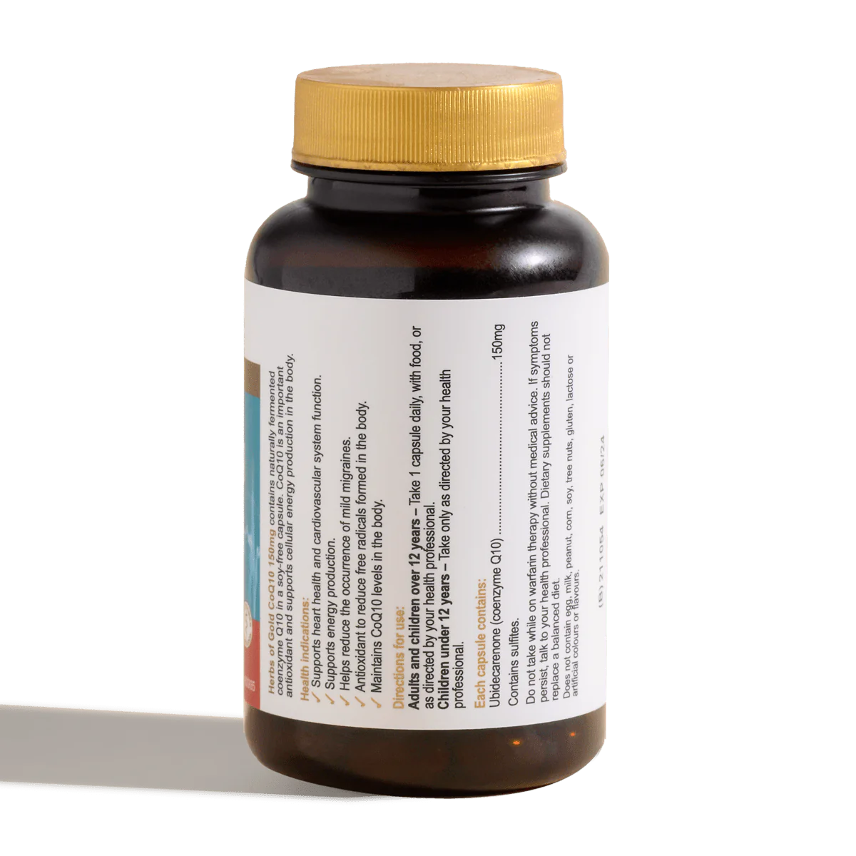 Herbs of Gold CoQ10 150mg 含有以无大豆米糠油为基质的天然发酵辅酶 Q10。
