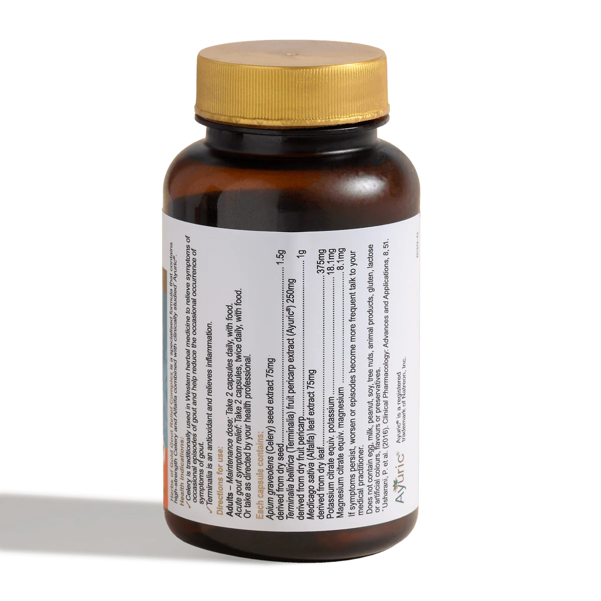 - 痛风缓解复合物是一种含有芹菜的综合配方,芹菜传统上在西方草药中用于缓解偶尔发作的痛风症状。