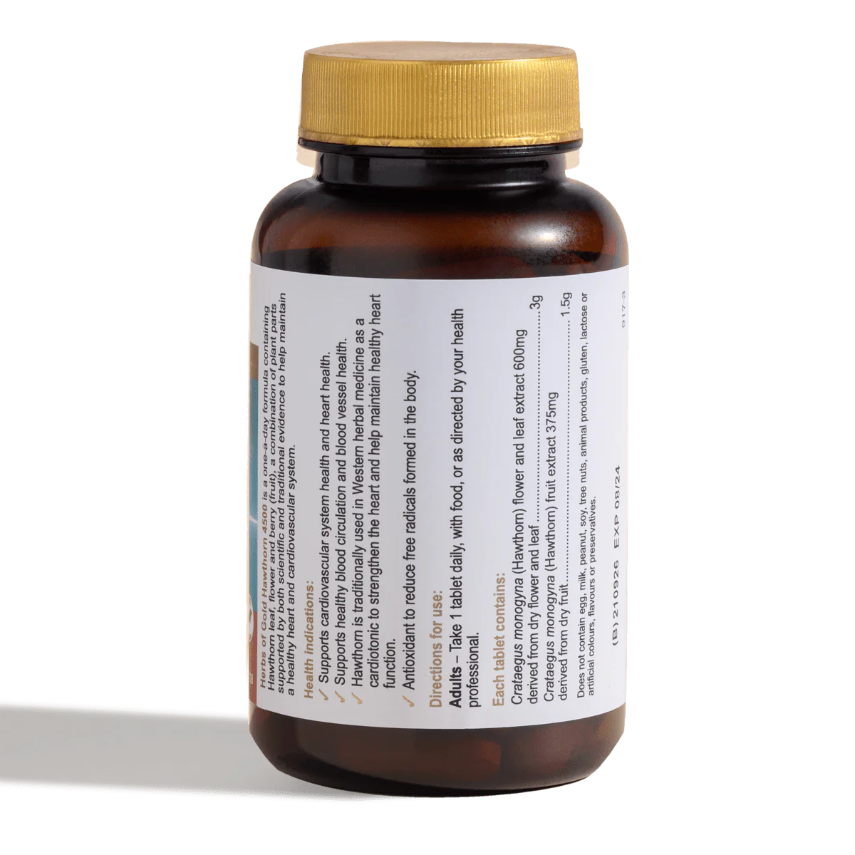 Herbs of Gold Hawthorn 4500 是一种每日一次的配方,含有山楂花、叶和浆果,有助于心血管系统健康。
