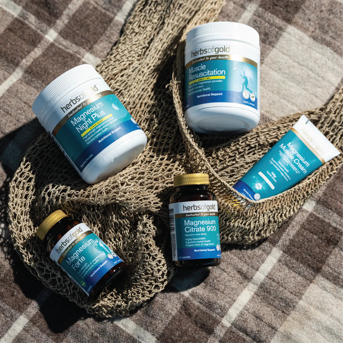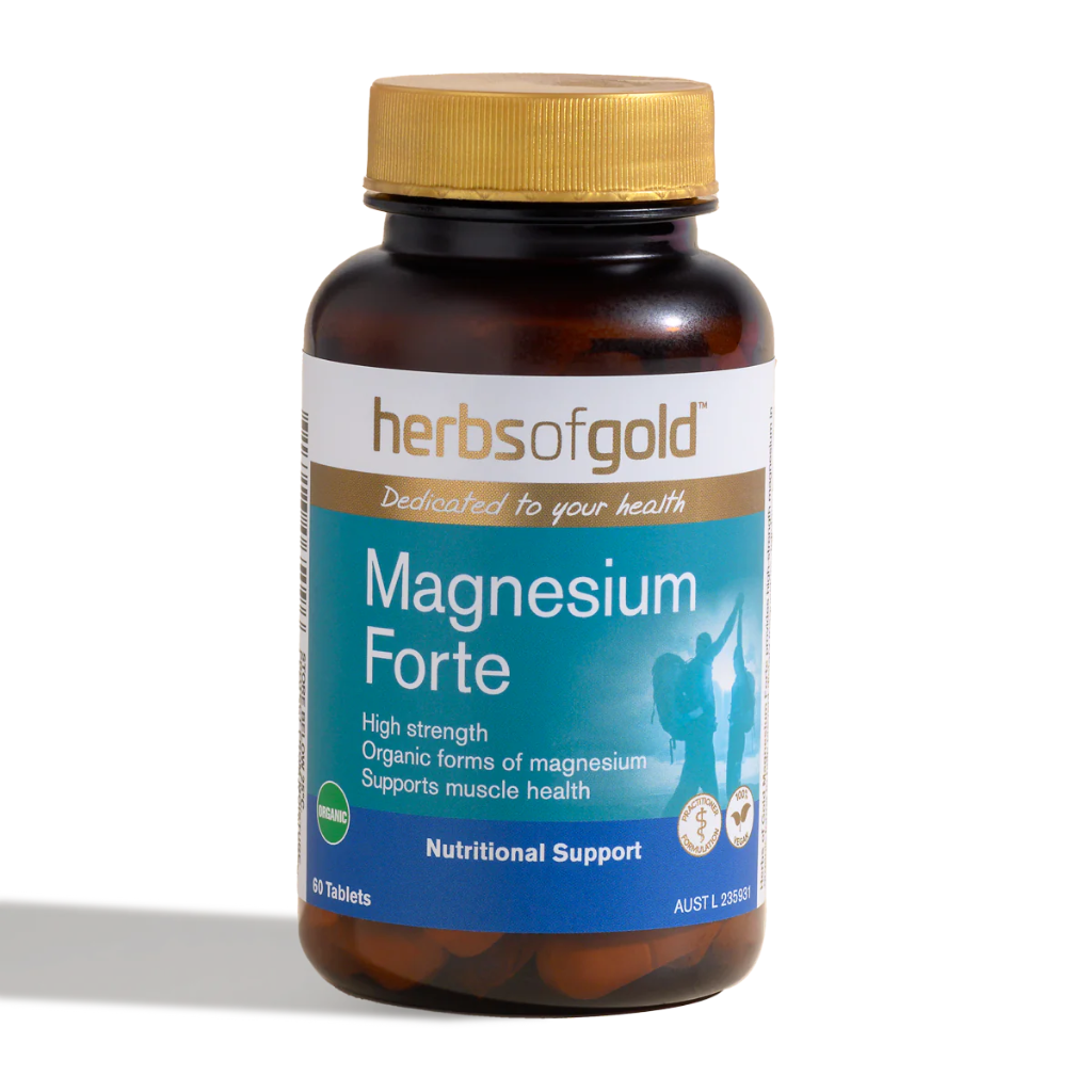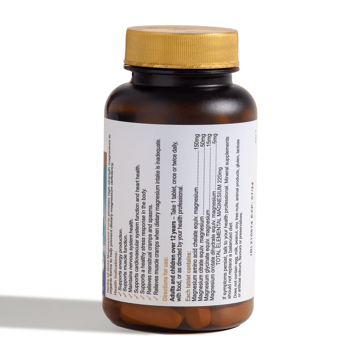 Herbs of Gold Magnesium Forte 含有四种有机形式的镁,它们可以被人体很好地吸收,从而支持健康的肌肉收缩功能和骨骼健康。