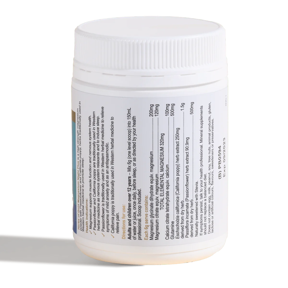 - Herbs of Gold Magnesium Night Plus 每份含有 320 毫克镁,由柠檬酸镁和甘氨酸镁组成,这两种镁都是易于吸收的形式。