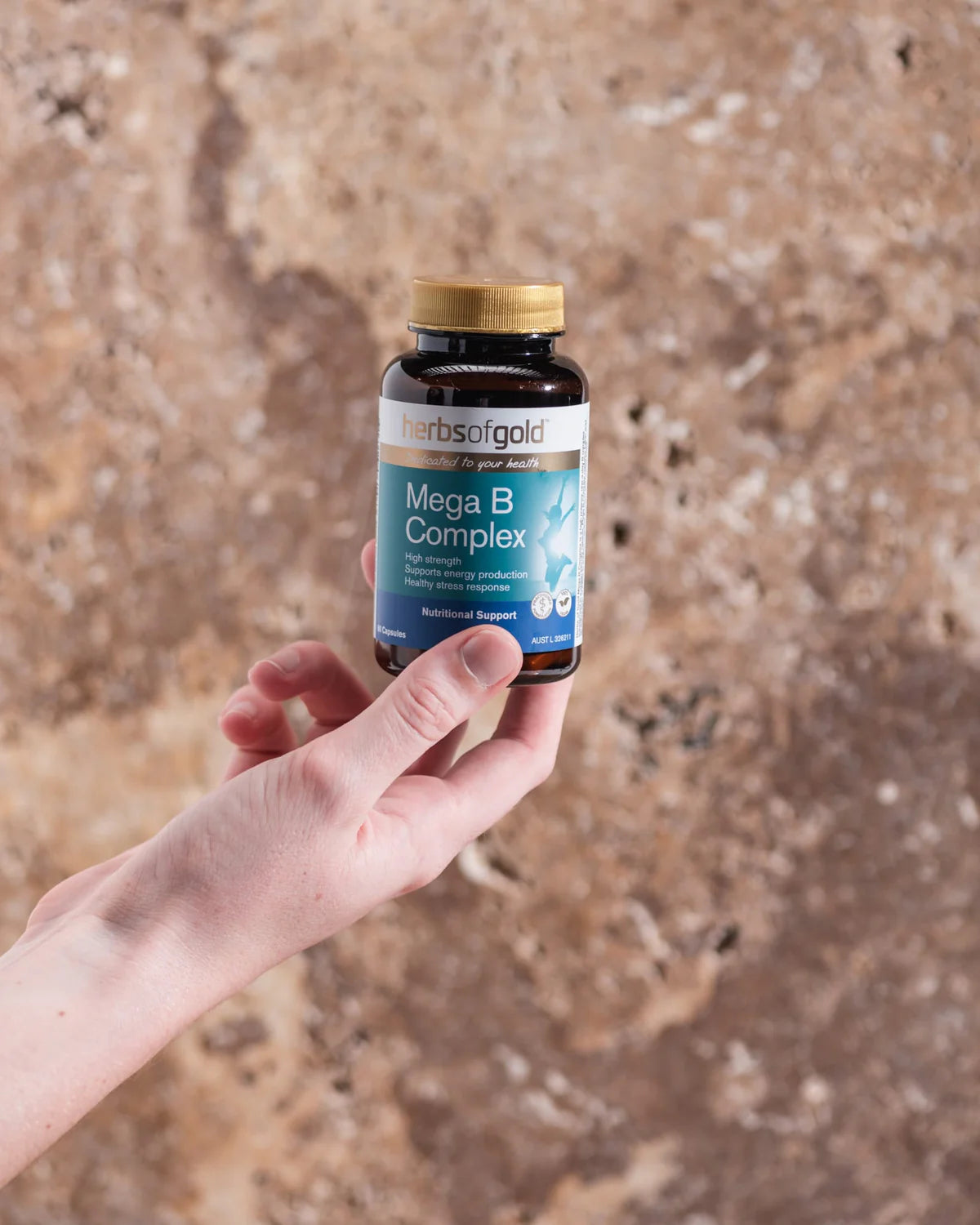 Herbs of Gold Mega B Complex 是一种高强度、每日一片的配方,可支持能量产生。