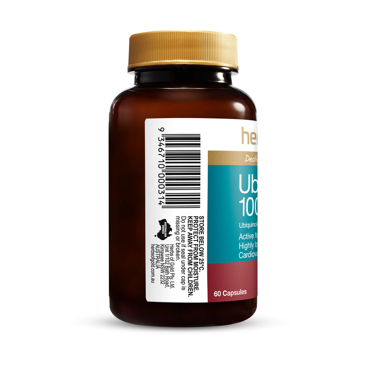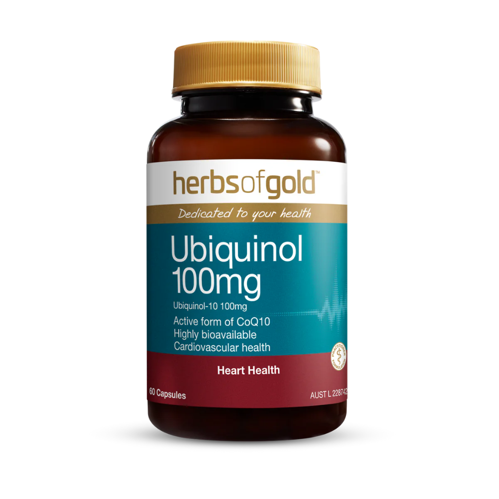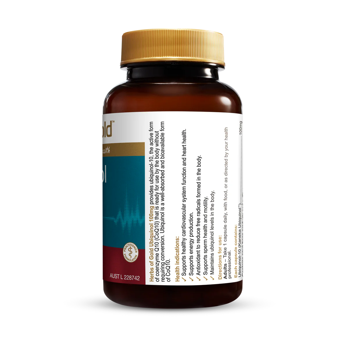Herbs of Gold Ubiquinol 100mg 含有生物可利用的辅酶 Q10 (CoQ10),可支持心血管系统健康。