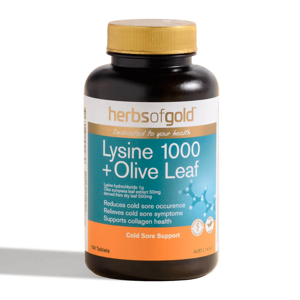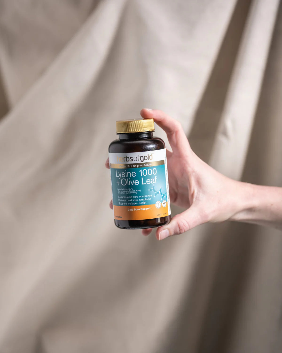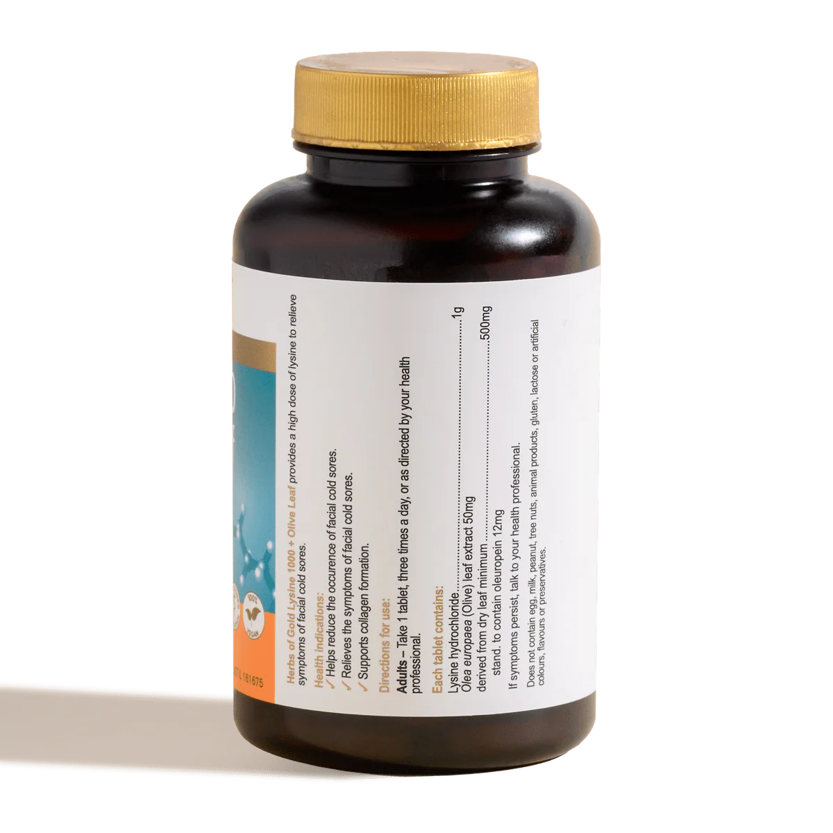 Herbs of Gold Lysine 1000 + Olive Leaf 含有高强度赖氨酸,可减轻面部唇疱疹的症状。