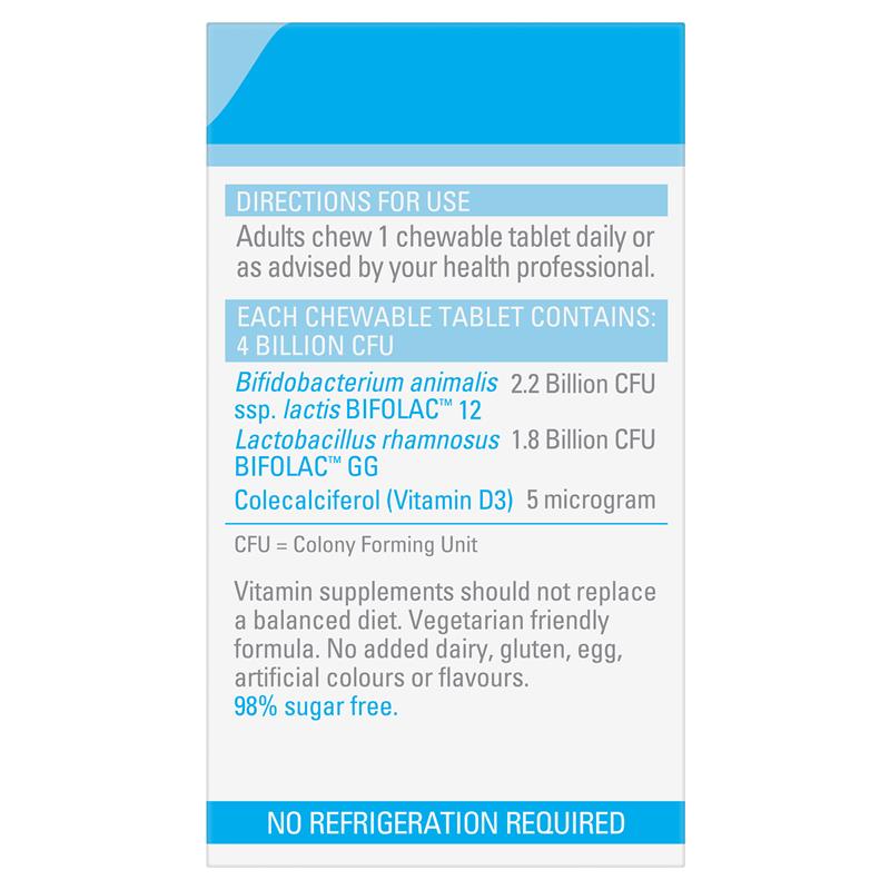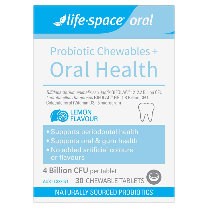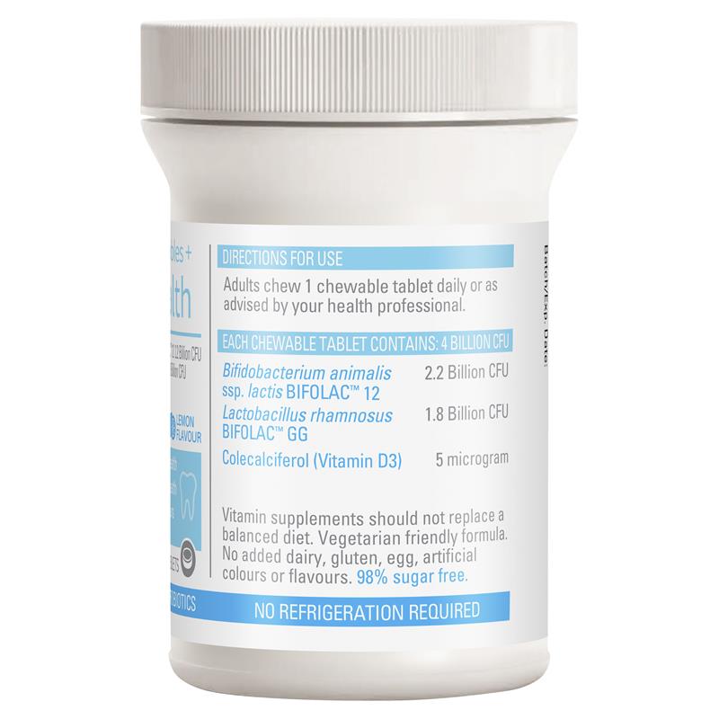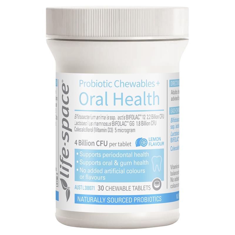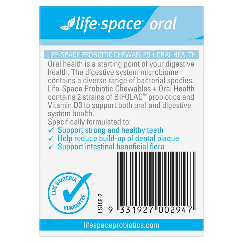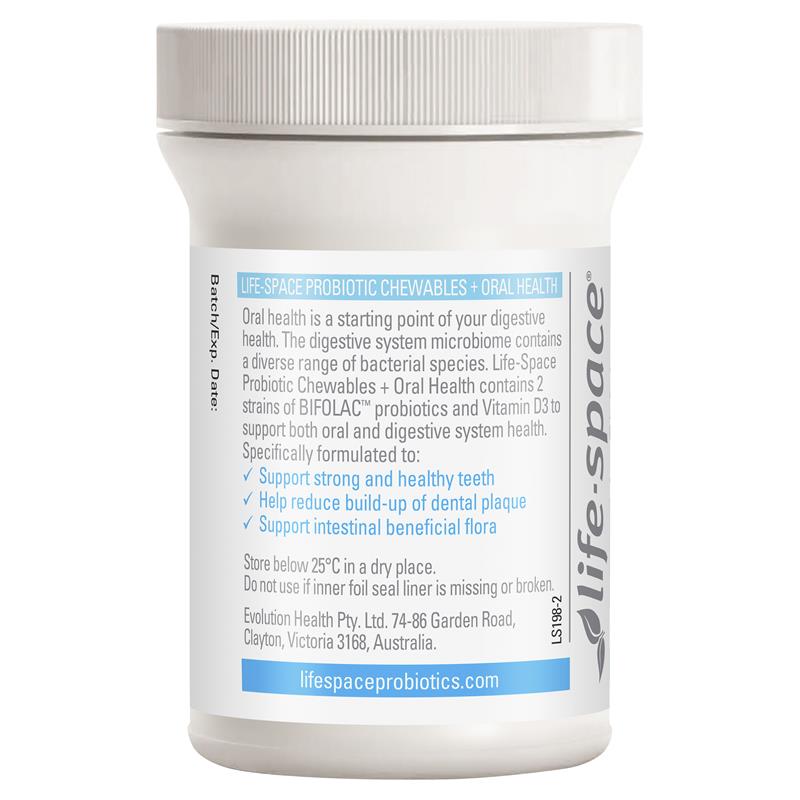 口腔健康是消化系统健康的起点。消化系统微生物群包含多种菌种。Life-Space益生菌咀嚼片+口腔健康配方含有2种BIFOLAC™益生菌和维生素D3,可同时支持口腔和消化系统健康。