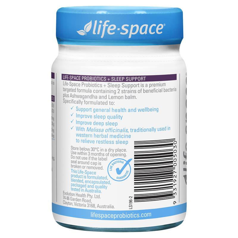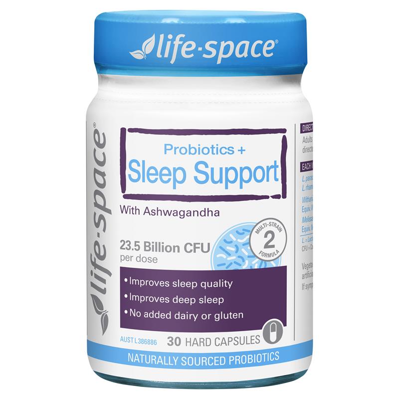 Life-Space Probiotics+ 睡眠支持是一种优质针对性配方,含有 2 种有益细菌以及南非醉茄和柠檬香蜂草,可改善睡眠质量