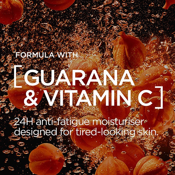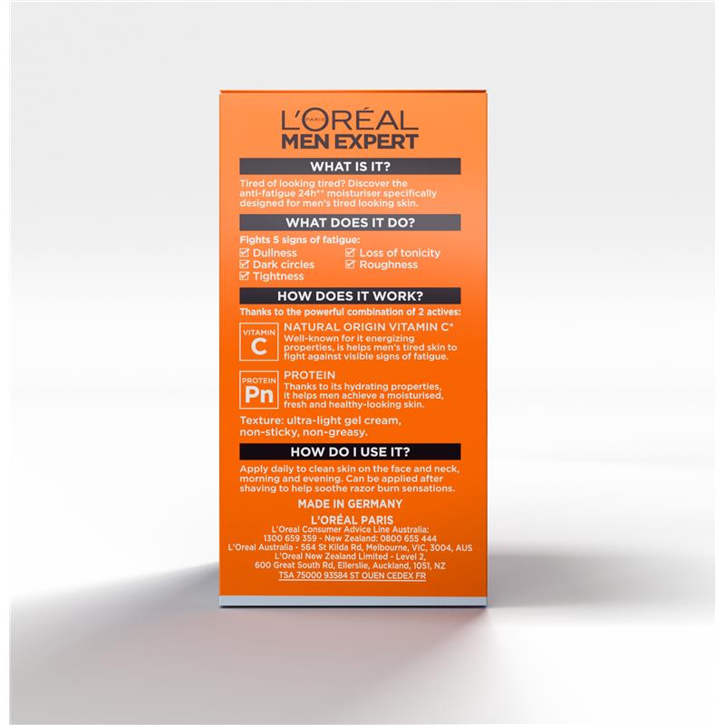 巴黎欧莱雅男士专业水润活力24小时抗疲劳保湿霜蕴含活力四射的瓜拉纳和维生素C,能瞬间唤醒疲惫肌肤,焕发活力。质地轻盈清爽,清凉不油腻,为肌肤24小时持久保湿,焕发活力。91%的男士表示,使用后肌肤瞬间焕发光彩。95%的男士表示,仅使用4周后,肌肤便焕发健康光泽。* *仪器测试容量:50毫升