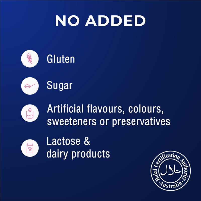 • 不添加:麸质、乳糖、糖、人工色素、人工香料、人工甜味剂、防腐剂或乳制品