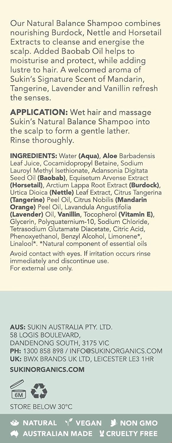 我们的自然平衡洗发水蕴含滋养的牛蒡、荨麻和马尾草提取物,能够清洁并激活头皮。添加猴面包树油,有助于滋润和保护秀发,同时赋予秀发光泽。Sukin 标志性的柑橘、柑橘、薰衣草和香兰素香气令人心旷神怡。原料