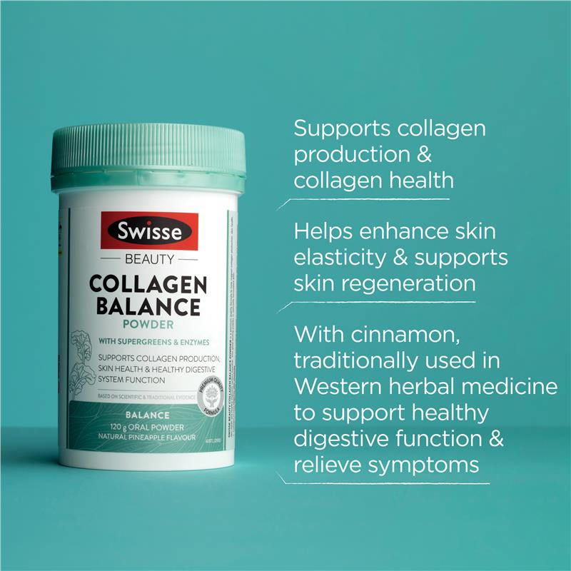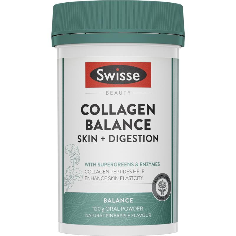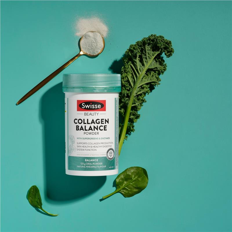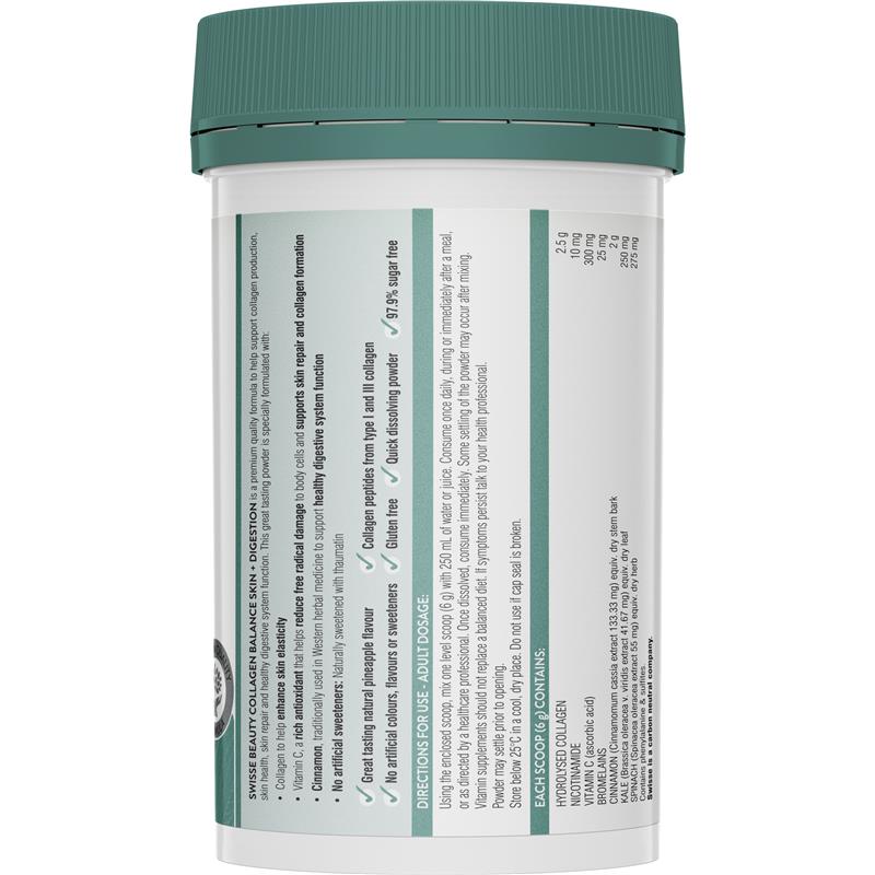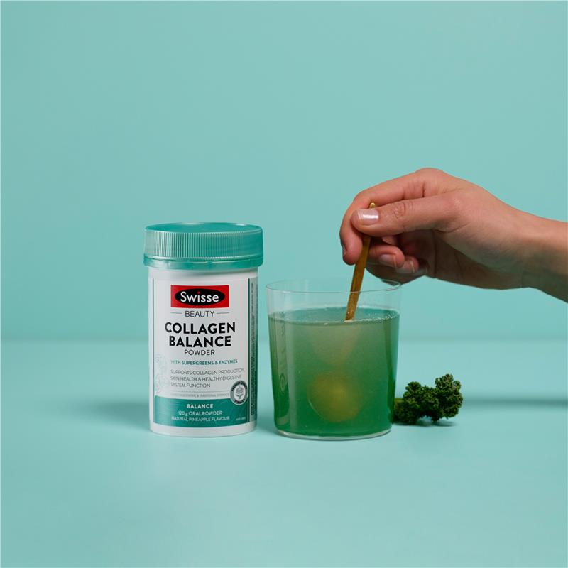 Swisse Beauty 胶原蛋白平衡皮肤 + 消化粉是一种味道鲜美的配方,可支持胶原蛋白的产生并有助于健康的消化系统功能。*具有美味的菠萝口味,富含胶原蛋白和维生素 C,可支持皮肤健康,超级绿色植物和酶可支持健康的消化系统功能。