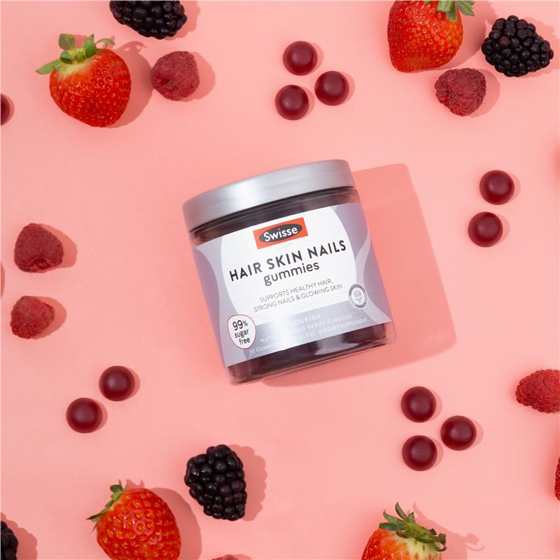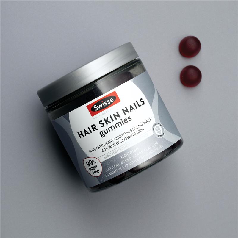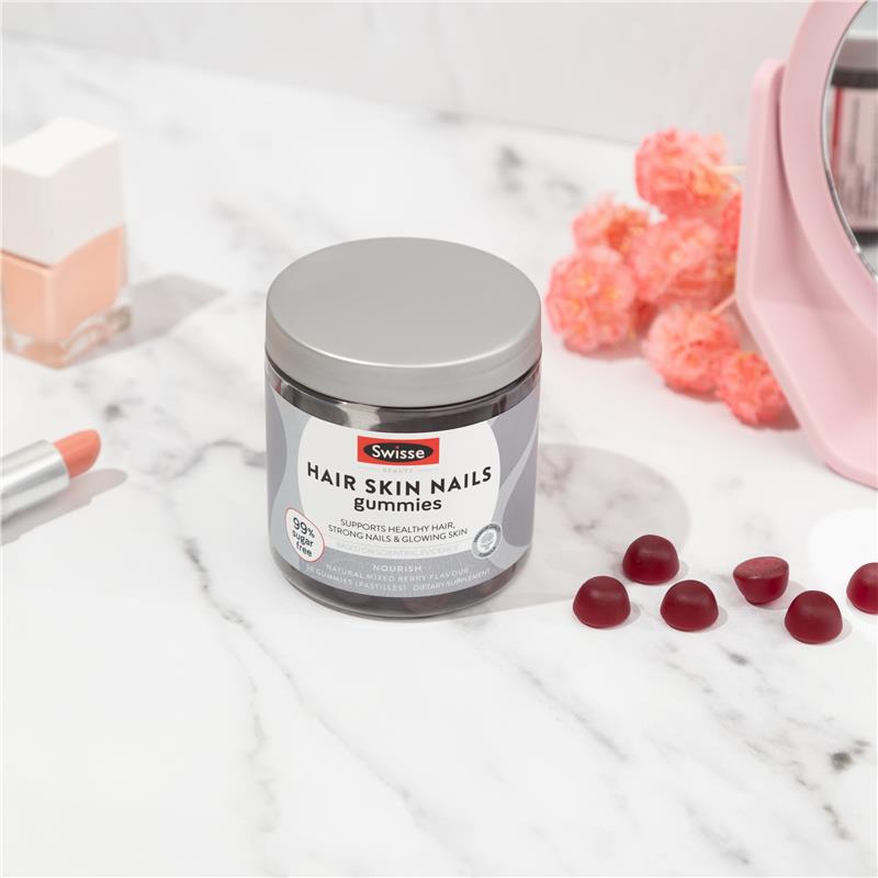 Swisse 美发护肤美甲软糖,由内而外呵护您的健康。它富含生物素,有助于指甲强韧和头发健康;维生素C,有助于皮肤健康;维生素E,具有抗氧化功效。这些美味软糖是您日常呵护的良伴,助您由内而外焕发光彩。享受拥有亮泽秀发、光彩照人的肌肤和强韧指甲的旅程,更添99%无糖口感。