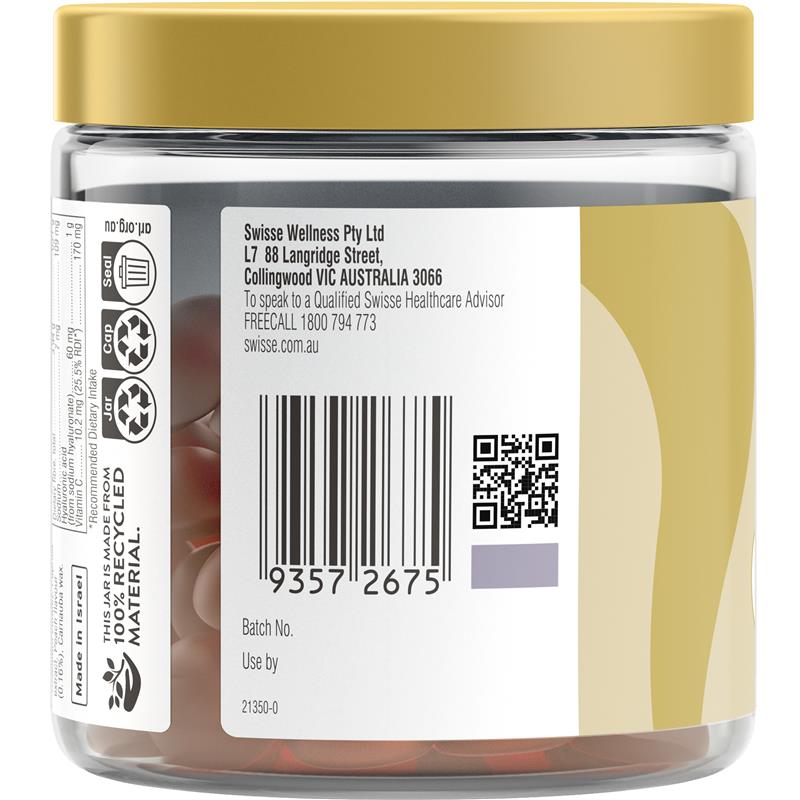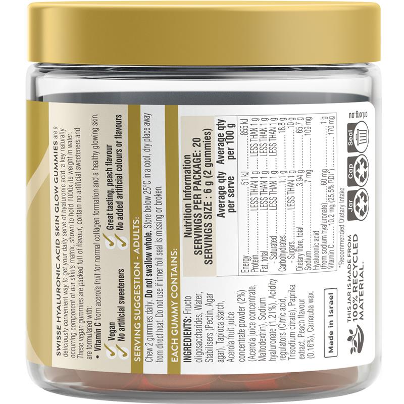 使用 Swisse Beauty 透明质酸亮肤软糖,开启焕发光彩的甜蜜之旅。这款软糖蕴含来自西印度樱桃的维生素 C,有助于促进胶原蛋白的正常生成,令肌肤健康亮丽。蕴含怡人的蜜桃口味,99% 无糖,是您日常美容的完美伴侣。