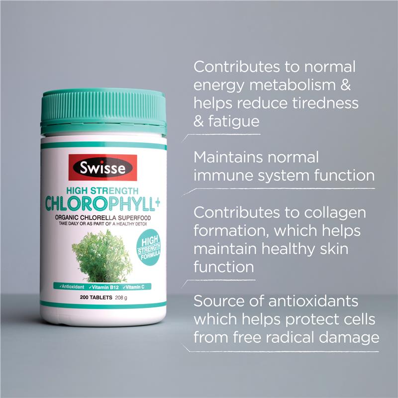 Swisse 高强度叶绿素+采用优质配方,蕴含有机小球藻。小球藻是一种绿色超级食品,可提供天然维生素和抗氧化剂,有助于支持能量代谢、免疫功能和肌肤健康。这款高强度叶绿素采用方便的片剂形式,让您既能享受叶绿素的益处,又不会感到刺鼻的味道。