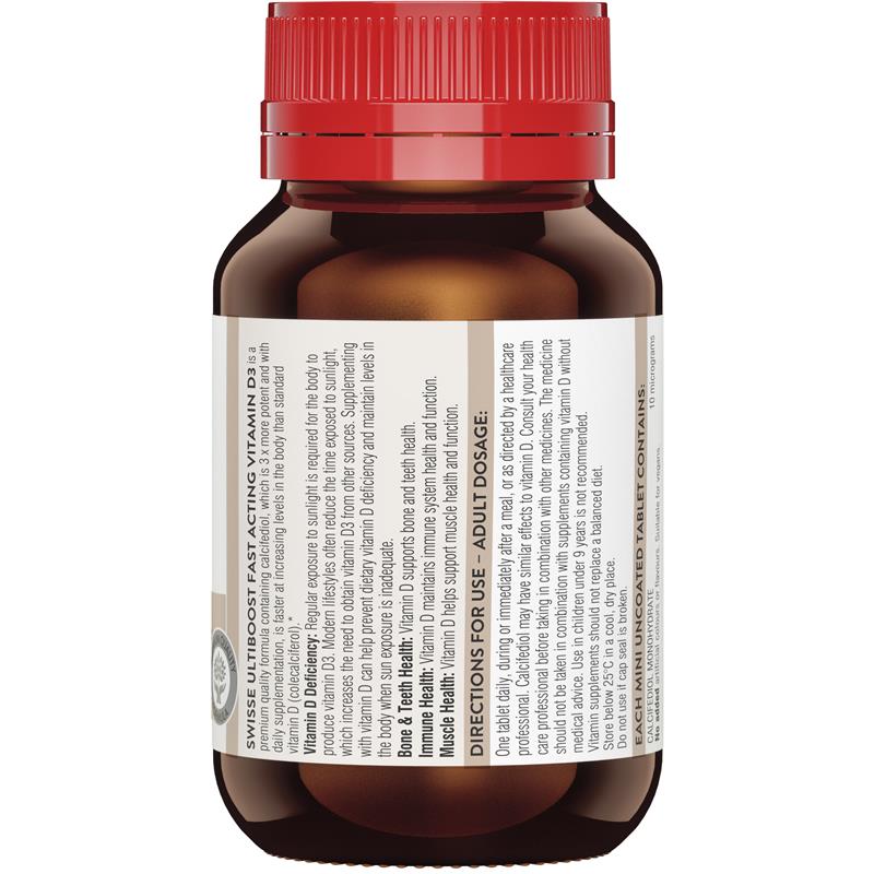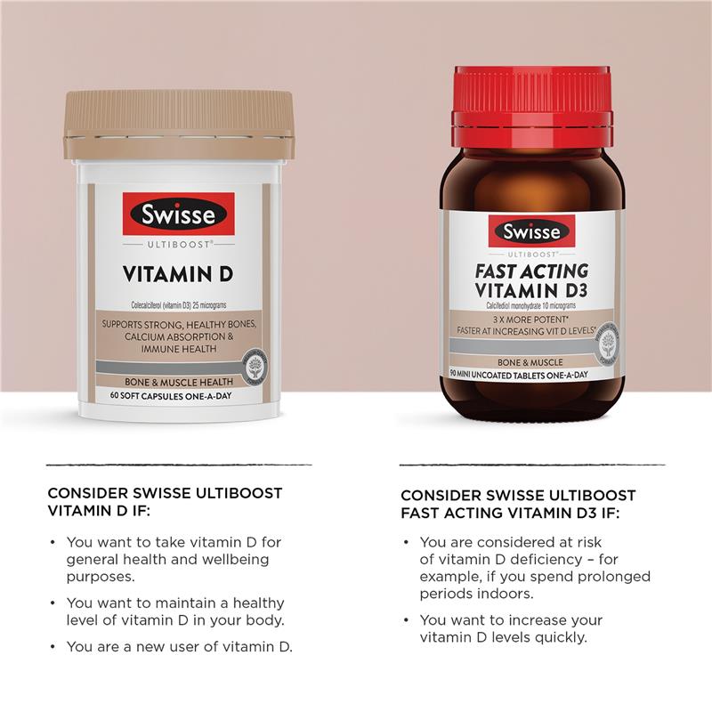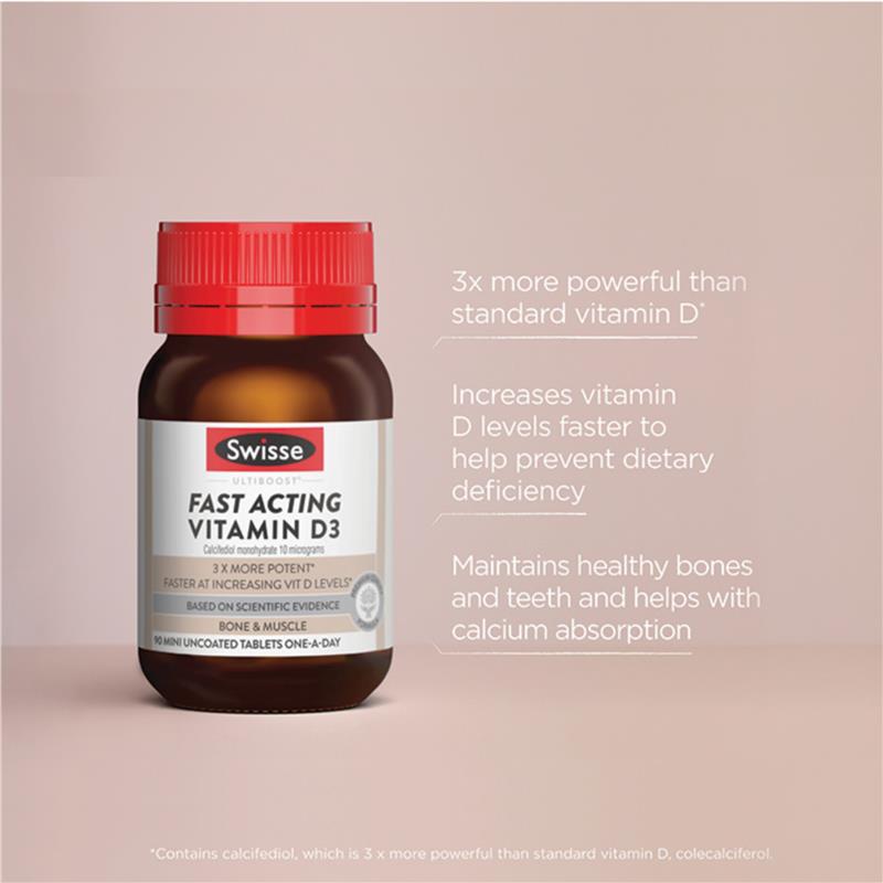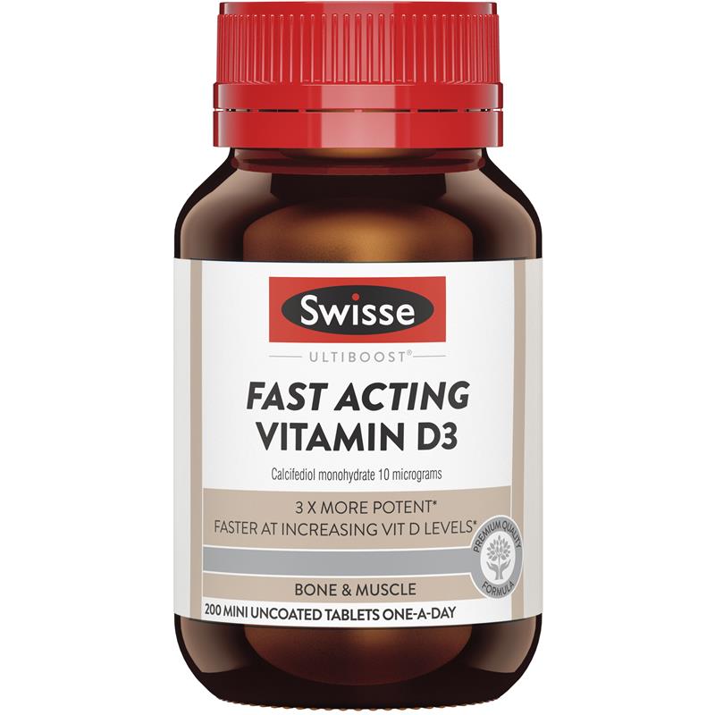 Swisse Ultiboost 速效维生素 D3 是一种优质配方,含有 骨化二醇,即 功效增强 3 倍 并且,通过每日补充,其在体内的含量增加速度比标准维生素 D(胆钙化醇)更快。