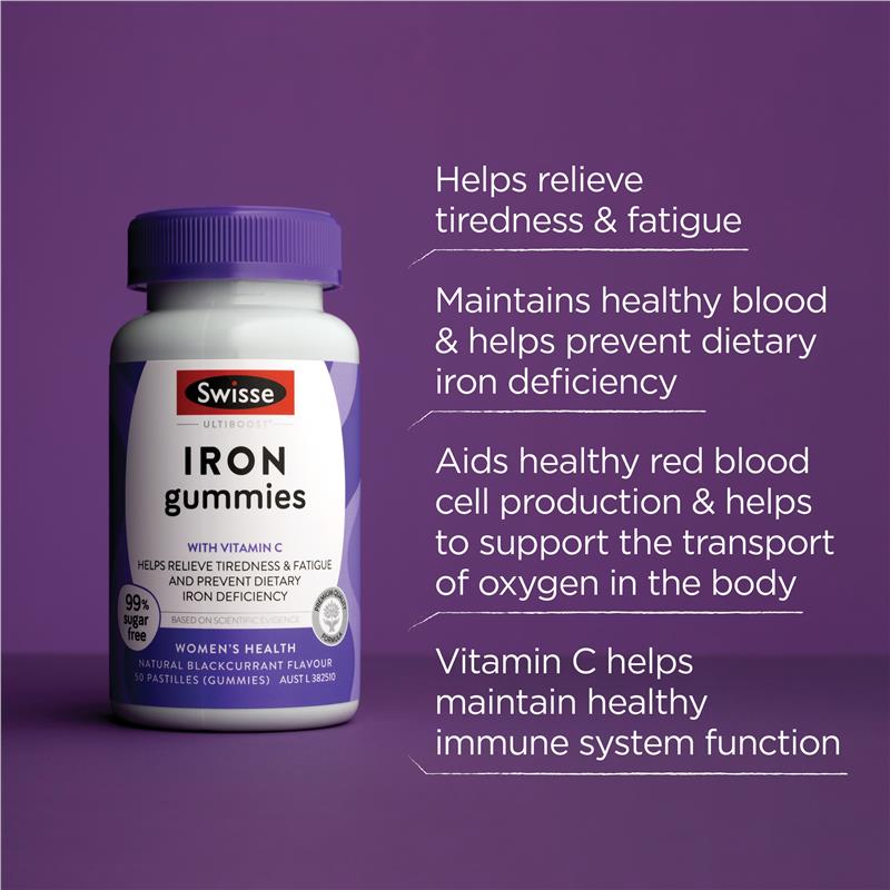 Swisse Ultiboost 补铁软糖美味又便捷,富含铁元素,有助于维持健康的铁含量。这款 99% 无糖软糖富含铁元素和维生素 C,维生素 C 是一种抗氧化剂,能够促进膳食铁的吸收,缓解疲劳。