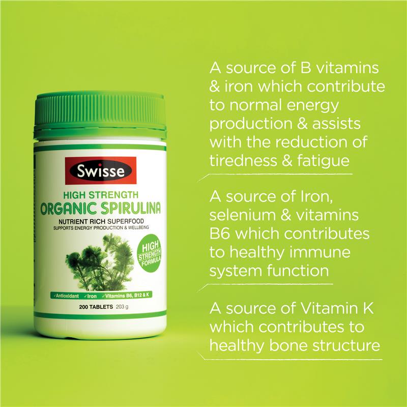 Swisse 高浓度有机螺旋藻采用优质配方,蕴含有机螺旋藻。螺旋藻是一种绿色超级食品,富含维生素、矿物质和抗氧化剂。本产品提供高浓度剂量,提供全食物来源的营养,有助于支持能量生成、免疫功能、骨骼结构和神经系统健康。