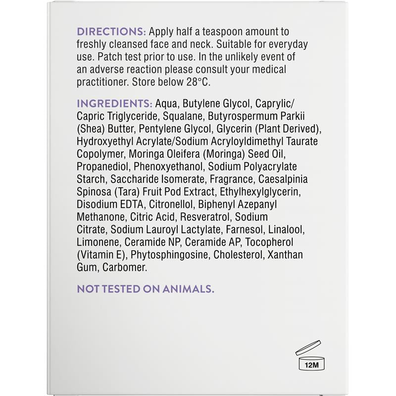 水(Aqua);1;3-丁二醇;辛酸/癸酸甘油三酯;角鲨烷;Butyrospermum Parkii(牛油果)油;戊二醇;甘油(植物衍生);丙烯酸羟乙酯/丙烯酰二甲基牛磺酸钠共聚物;辣木籽油;丙二醇;苯氧乙醇;聚丙烯酸钠淀粉;糖异构体;香精;Caesalpinia Spinosa(Tara)果荚提取物;乙基己基甘油;乙二胺四乙酸二钠;香茅醇;联苯氮杂环庚烷基甲酮;柠檬酸;白藜芦醇;柠檬酸钠;月桂酰乳酸钠;金合欢醇;芳樟醇;柠檬烯;神经酰胺 NP;生育酚(维生素 E);植物鞘氨醇;胆固醇;黄原胶;卡波姆