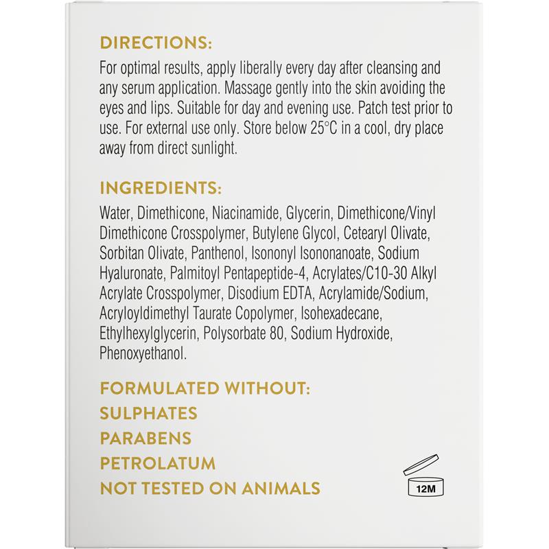 水、聚二甲基硅氧烷、烟酰胺、甘油、聚二甲基硅氧烷/乙烯基聚二甲基硅氧烷交联聚合物、丁二醇、鲸蜡硬脂醇橄榄油酸酯、脱水山梨糖醇橄榄油酸酯、泛醇、异壬酸异壬酯、透明质酸钠、棕榈酰五肽-4、丙烯酸酯/C10-30 烷基丙烯酸酯交联聚合物、乙二胺四乙酸二钠、丙烯酰胺/钠、丙烯酰二甲基牛磺酸酯共聚物、异十六烷、乙基己基甘油、聚山梨醇酯 80、氢氧化钠、苯氧乙醇。