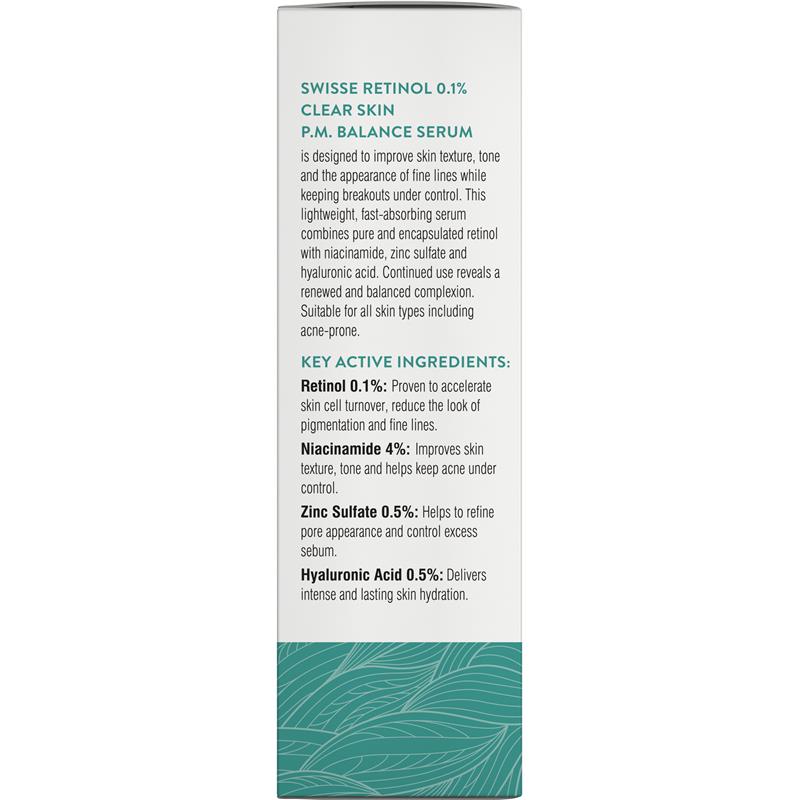 Swisse 视黄醇 0.1% 清透肌肤晚间平衡精华液,可改善肤质、肤色,淡化细纹,同时有效控制痘痘。这款质地轻盈、吸收迅速的精华液,专为您晚间护肤程序而设计,蕴含纯净胶囊视黄醇、烟酰胺、硫酸锌和透明质酸。持续使用,肌肤将焕然一新,平衡水润。本产品由皮肤科医生联合研发,适用于所有肤质,包括易长痘的肌肤。