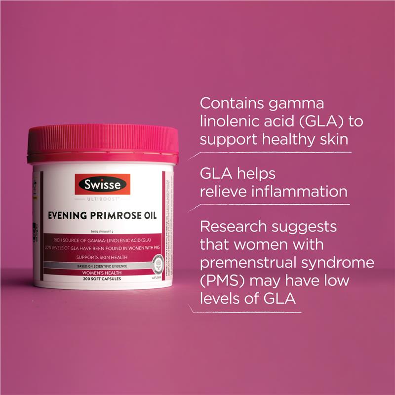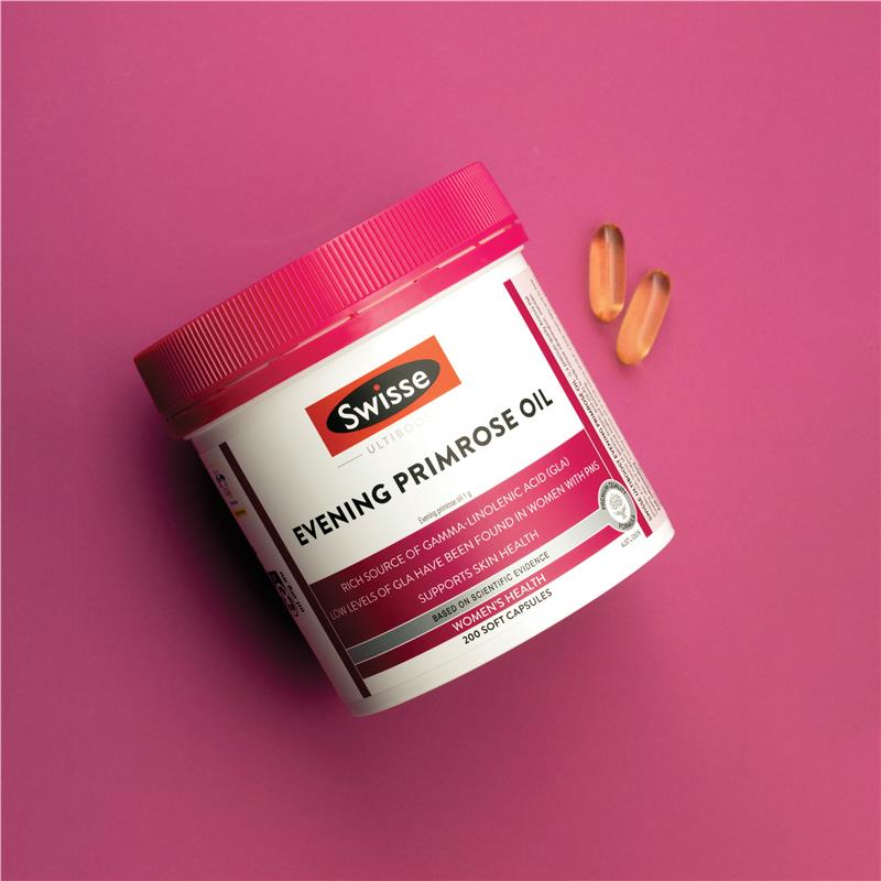 Swisse Ultiboost 月见草油有助于缓解炎症,促进健康,并维持健康的肌肤。它富含γ-亚麻酸 (GLA),这是一种长链脂肪酸,研究表明,患有经前综合症 (PMS) 的女性体内的γ-亚麻酸含量可能较低。
