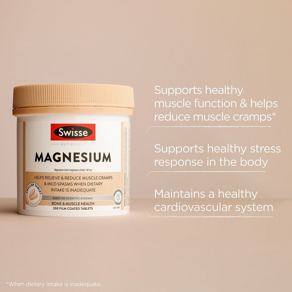 Swisse Ultiboost 镁补充剂能够支持健康的肌肉功能和放松,并在饮食摄入不足时减少肌肉痉挛和轻微抽搐。这款优质补充剂富含柠檬酸镁,有助于优化吸收。它专为积极运动的生活方式人士研发,还能维持神经系统健康,支持身体应对压力,维持能量生成,并支持心脏健康。每日服用,作为您日常保健计划的一部分,有助于维持体内充足的镁含量。适合:纯素食者和素食者
