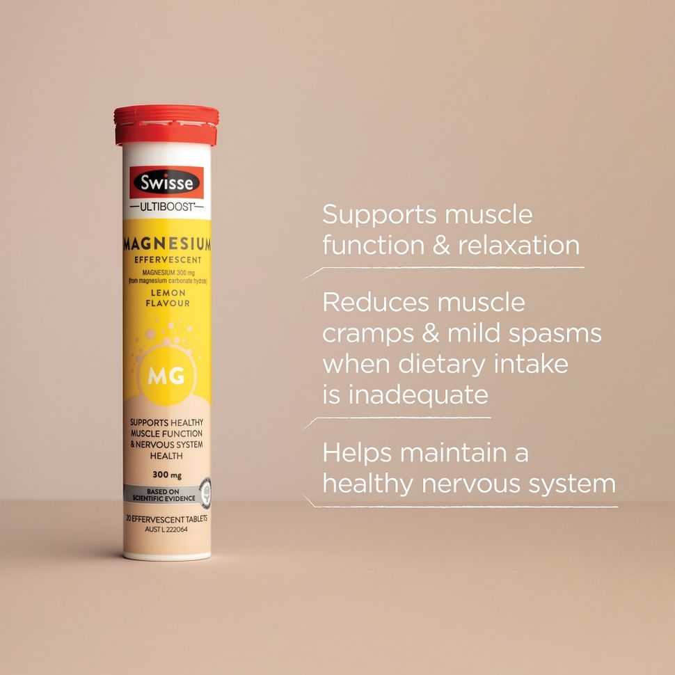 Swisse Ultiboost 镁泡腾片以科学证据为基础,通过健康的肌肉功能支持积极的生活方式。它采用便捷的每日一次剂量,有助于支持肌肉健康和放松,在饮食中镁摄入不足时帮助减少肌肉抽筋和轻度肌肉痉挛,并维持神经系统健康。对于吞咽大片剂或胶囊有困难的人来说,这款柠檬味配方提供了一个美味的替代品。