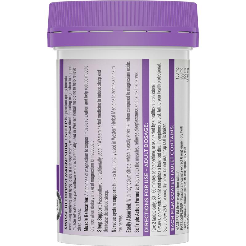 Swisse Ultiboost 镁+睡眠补充剂是一款三重功效的补充剂,蕴含强效的营养成分和草本成分,有助于安稳睡眠。这款优质配方包含有助于肌肉放松的镁、西番莲(传统上在西方草药中用于缓解失眠)以及啤酒花(传统上在西方草药中用于舒缓和镇静神经)。睡前服用本补充剂,有助于安稳睡眠。