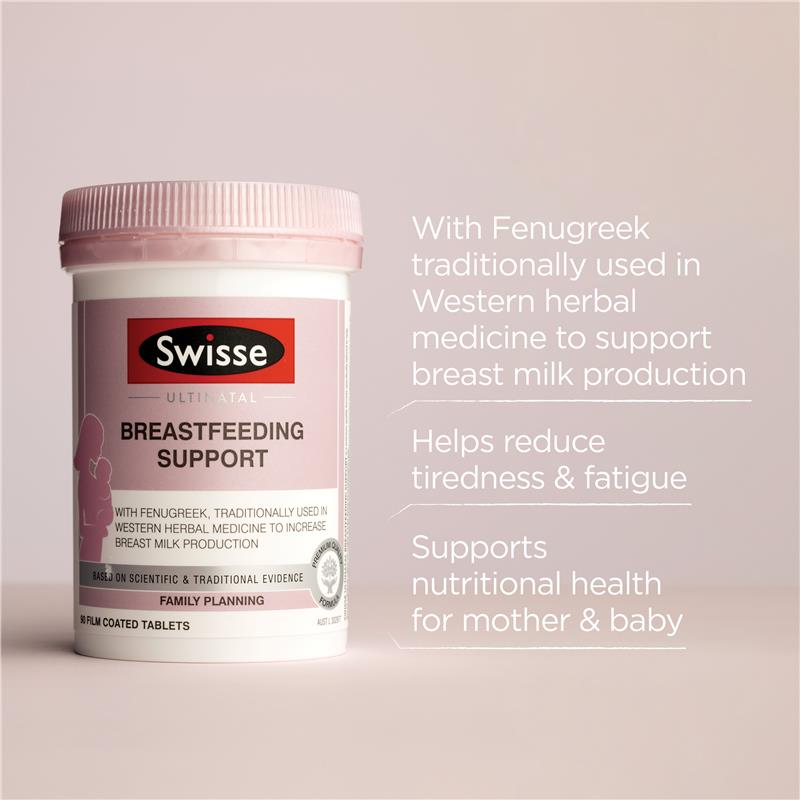 Swisse Ultinatal 母乳喂养支持片采用优质配方,专为在母乳喂养期间为母亲和宝宝提供营养支持而设计。配方中蕴含胡芦巴,胡芦巴在传统西方草药中被用作催乳剂,有助于促进母乳分泌。B 族维生素可缓解疲劳,并提供营养支持,帮助预防母乳喂养期间的营养缺乏。