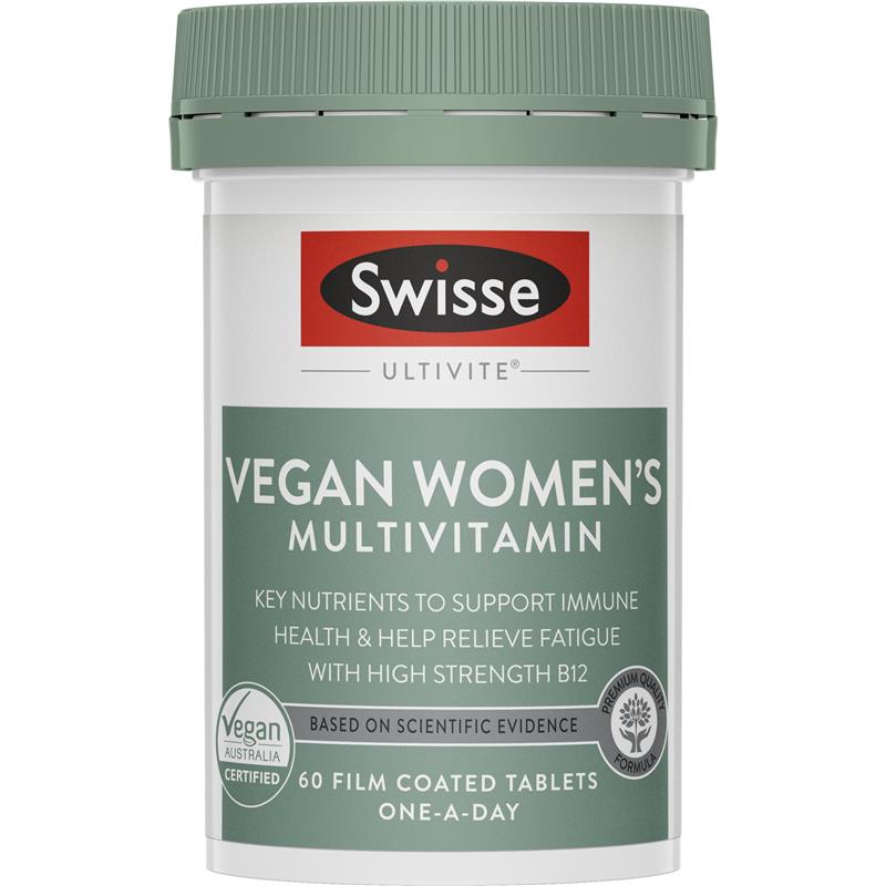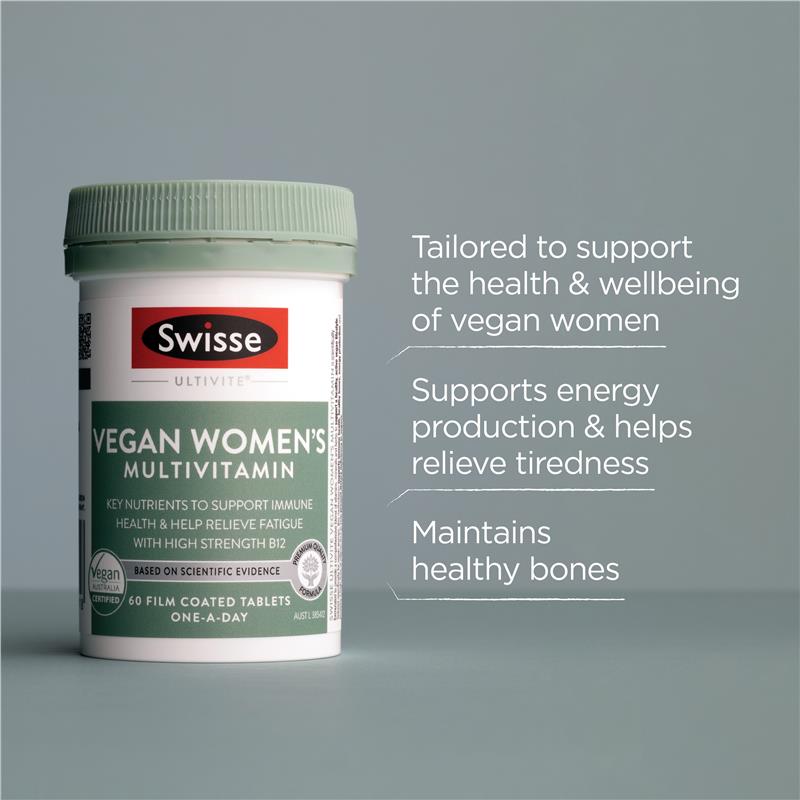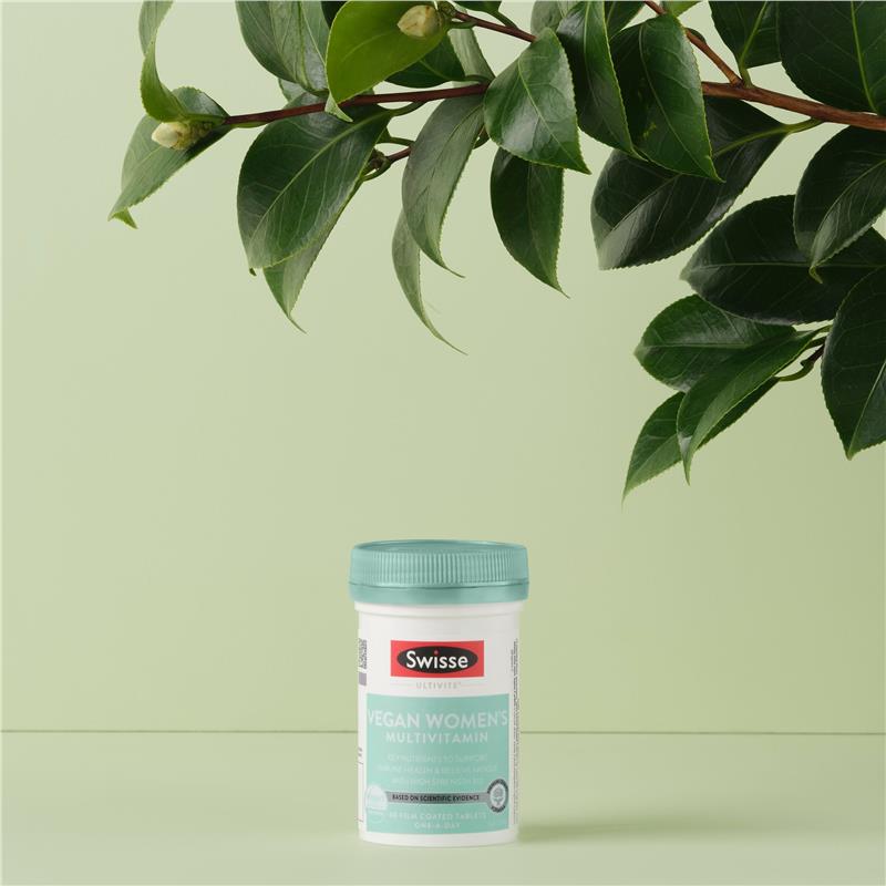 用 Swisse Ultivite 纯素女士复合维生素开启您的一天。它富含维生素 D,有助于骨骼健康;维生素 B12,有助于能量生成。本配方富含植物成分和抗氧化剂,专为支持您的纯素生活方式而设计。