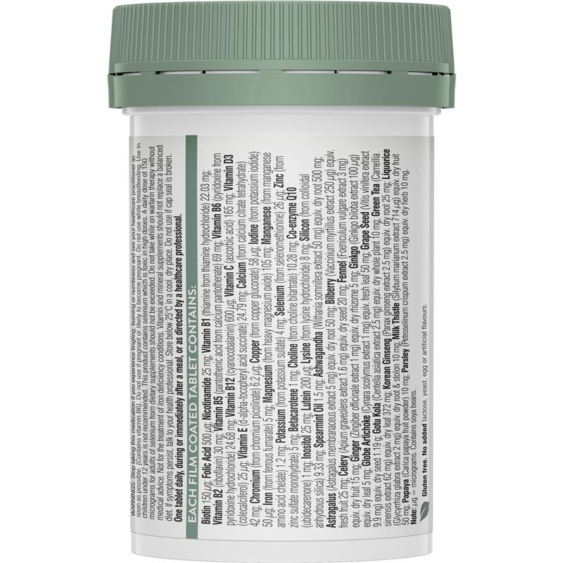 生物素 150 µg;叶酸 500 µg;烟酰胺 25 mg;维生素 B1(硫胺素,来自盐酸硫胺素)22.03 mg;维生素 B2(核黄素)30 mg;维生素 B5(泛酸,来自泛酸钙)69 mg;维生素 B6(吡哆醇,来自盐酸吡哆醇)24.68 mg;维生素 B12(氰钴胺素)600 µg;维生素 C(抗坏血酸)165 mg;维生素 D3(胆钙化醇)25 µg;维生素 E(d-α-生育酚琥珀酸酯)24.79 mg;钙(来自四水柠檬酸钙)42 mg;铬(来自吡啶甲酸铬)6.2 µg;铜(来自葡萄糖酸铜)58 µg;碘(来自碘化钾)50微克;铁(来自富马酸亚铁)5毫克;镁(来自重氧化镁)105毫克;锰(来自氨基酸锰螯合物)1.2毫克;钾(来自硫酸钾)4毫克;硒(来自硒代蛋氨酸)26微克;锌(来自一水硫酸锌)5毫克;β-胡萝卜素1毫克;胆碱(来自酒石酸胆碱)10.28毫克;辅酶Q10(泛癸利酮)1毫克;肌醇25毫克;叶黄素200微克;赖氨酸(来自盐酸赖氨酸)8毫克;硅(来自胶体无水二氧化硅)9.33毫克;留兰香油1.5毫克;南非醉茄(Withania somnifera提取物50毫克)当量。干燥根 500 毫克;黄芪(Astragalus membranaceus 提取物 5 毫克)相当于干燥根 50 毫克;越橘(Vaccinium myrtillus 提取物 250 µg)相当于新鲜水果 25 毫克;芹菜(Apium graveolens 提取物 1.6 毫克)相当于干燥种子 20 毫克;茴香(Foeniculum vulgare 提取物 3 毫克)相当于干果 15 毫克;生姜(Zingiber officinale 提取物 1 毫克)相当于干燥根茎 5 毫克;银杏(银杏提取物 100 µg)相当于干燥叶 5 毫克;朝鲜蓟(Cynara scolymus 提取物 1 毫克)相当于新鲜叶 50 毫克;葡萄籽(Vitis vinifera 提取物 9.9 毫克)相当于干燥种子 1.19 克;积雪草(积雪草提取物 2.5 毫克)相当于干燥全株 10 毫克;绿茶(茶树提取物 62 毫克)相当于干燥叶 372 毫克;高丽参(人参提取物 5 毫克)相当于干燥根 25 毫克;甘草(光果甘草提取物 2 毫克)相当于干燥根和匍匐茎 10 毫克;水飞蓟(水飞蓟提取物 714 微克)相当于干果 50 毫克;木瓜(番木瓜果粉)10 毫克;欧芹(欧芹提取物 2.5 毫克)相当于干燥草本 10 毫克。