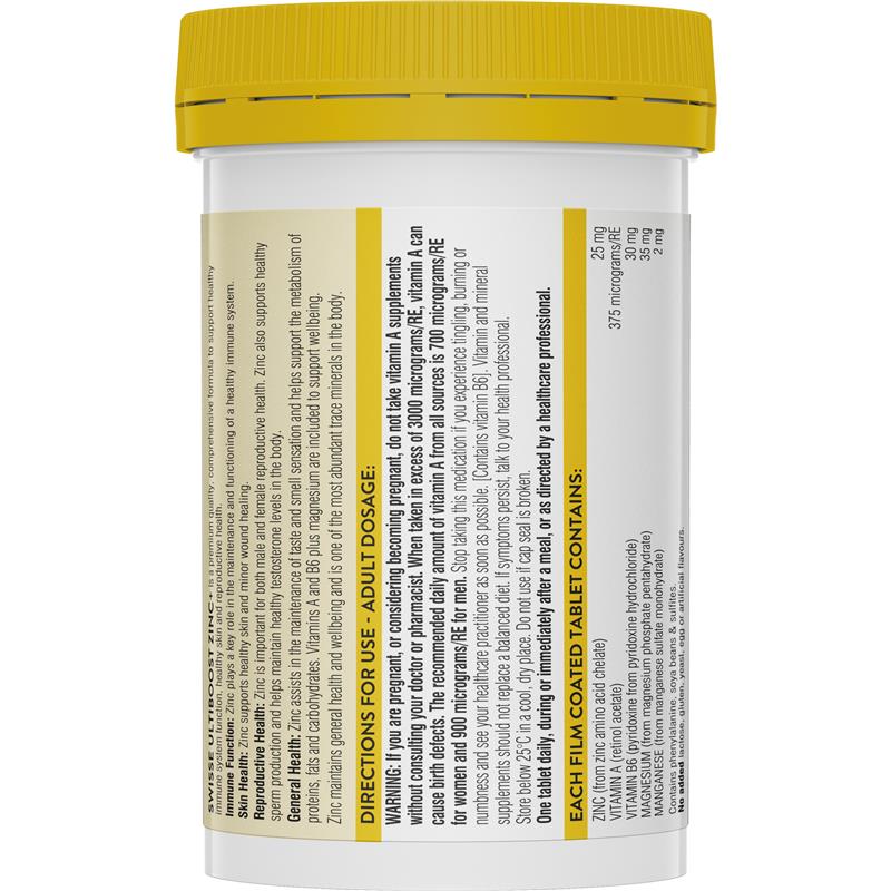 Swisse Ultiboost Zinc+ 有助于维持整体健康,特别是免疫系统功能、皮肤健康以及男性和女性的生殖健康。这款优质补充剂还富含维生素 A、维生素 B6 和镁,有助于维持整体健康。