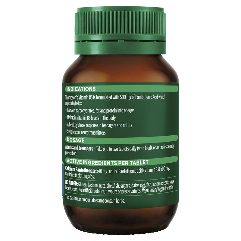 汤普森维生素 B5 含有 500 毫克泛酸,可支持/帮助:- 将碳水化合物、脂肪和蛋白质转化为能量