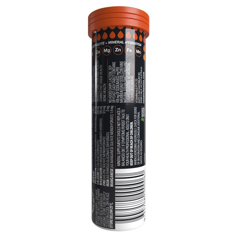 请务必阅读标签。请遵循使用说明。维生素和矿物质补充剂不应取代均衡饮食。如果症状持续,请咨询您的医疗保健专业人员。仅限成人。请将本品放在儿童不能接触的地方。将管子盖紧,存放在阴凉干燥处。储存在 25°C 以下。如果防篡改密封破损或缺失,请勿使用。每片含 436 毫克钠(每日最大剂量 872 毫克)。含糖(葡萄糖)。