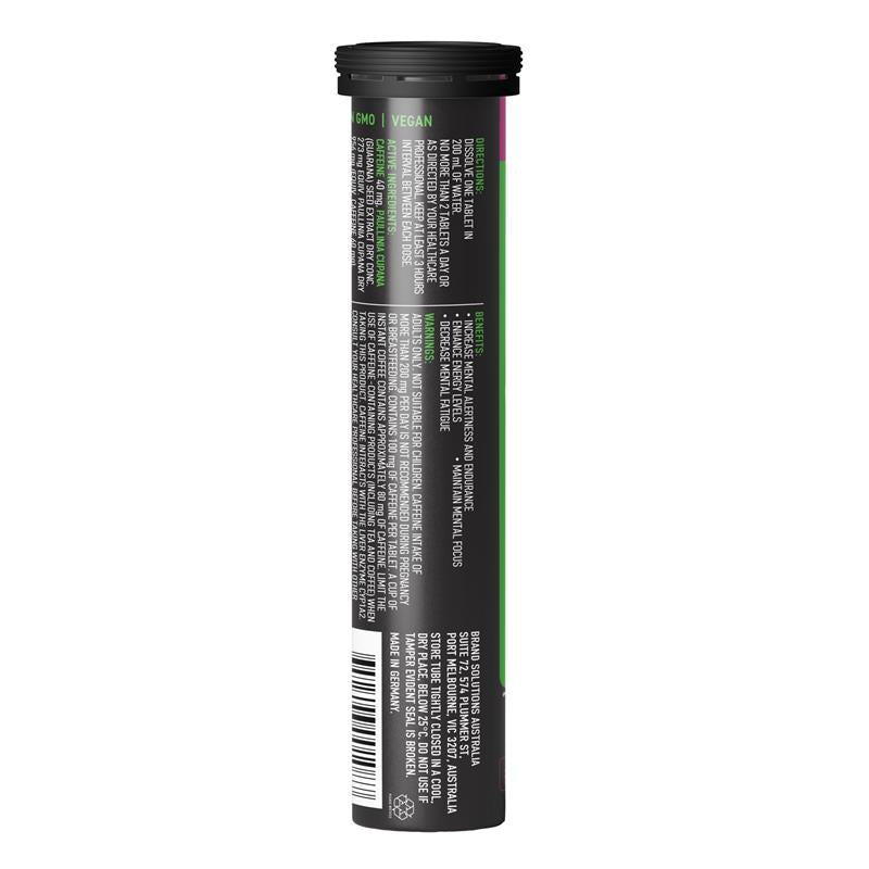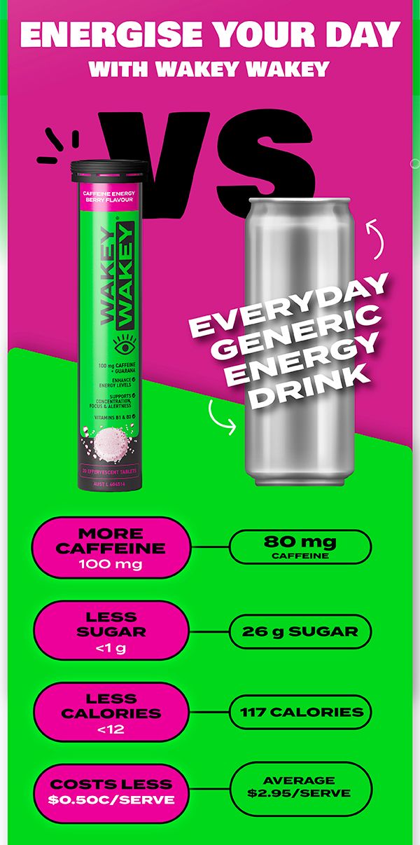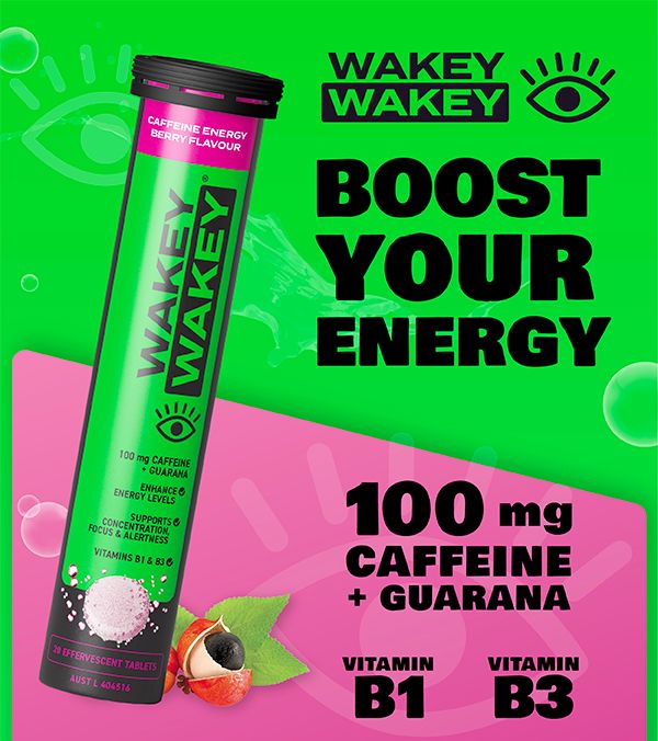 Wakey Wakey 能量浆果泡腾片含有 100 毫克咖啡因 + 瓜拉那以及维生素 B1 和 B3。