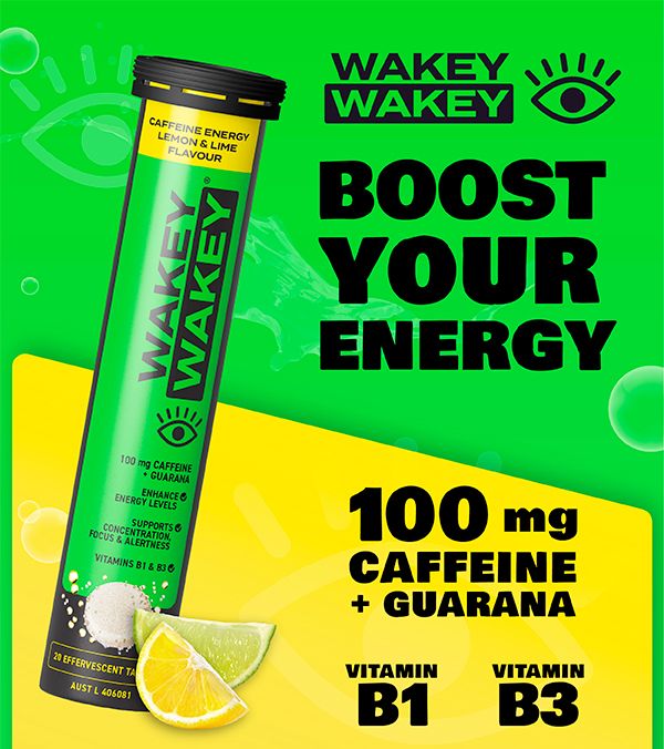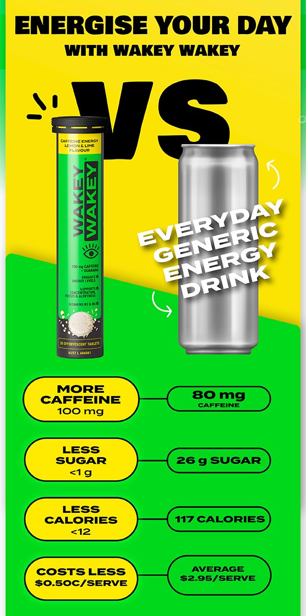 Wakey Wakey 能量泡腾片,柠檬青柠口味。含100毫克咖啡因和瓜拉那。提升能量水平,增强注意力、专注力和警觉性。富含维生素B1和B3,热量低于12卡路里。适用对象:成人