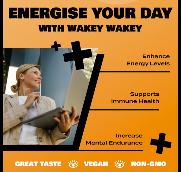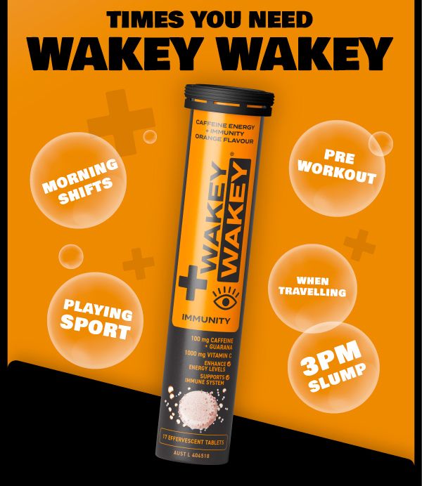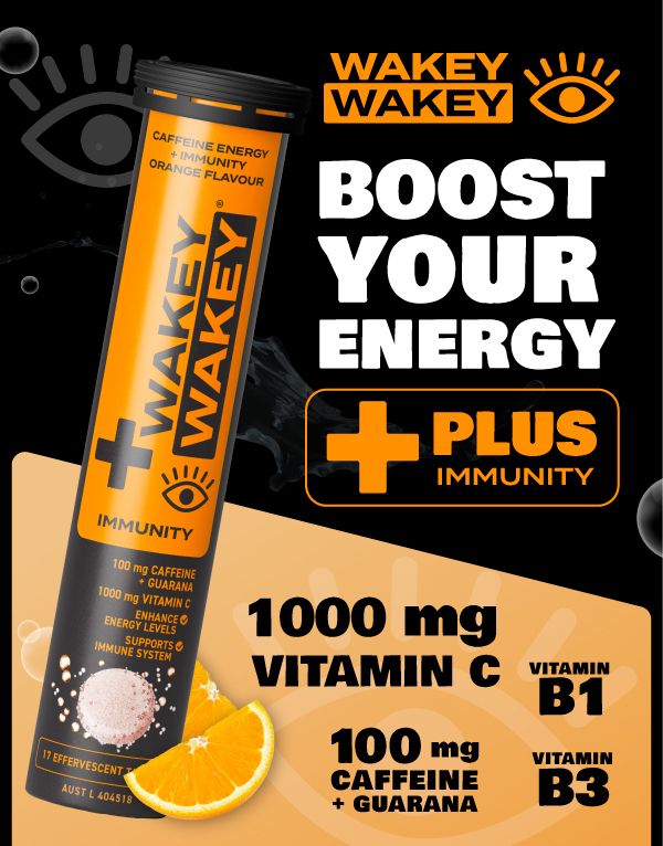 Wakey Wakey 咖啡因加免疫能量泡腾片含有 100 毫克咖啡因 + 瓜拉那以及 1000 毫克维生素 C。可提高能量水平,支持免疫健康。适用对象:成人