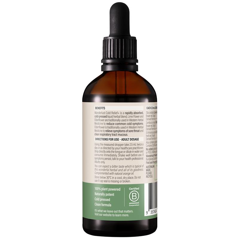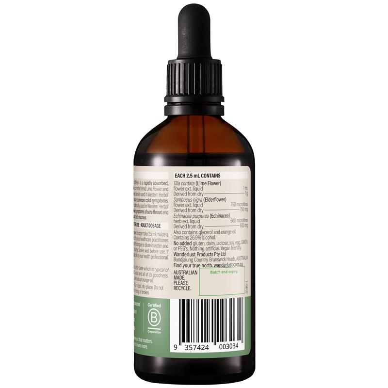 Wanderlust Cold Relief+ 是一款快速吸收的冷榨液体草本混合物。青柠花和接骨木花传统上在西方草药中用于缓解普通感冒症状。接骨木花传统上在西方草药中用于缓解咽喉痛症状和清除呼吸道黏液。