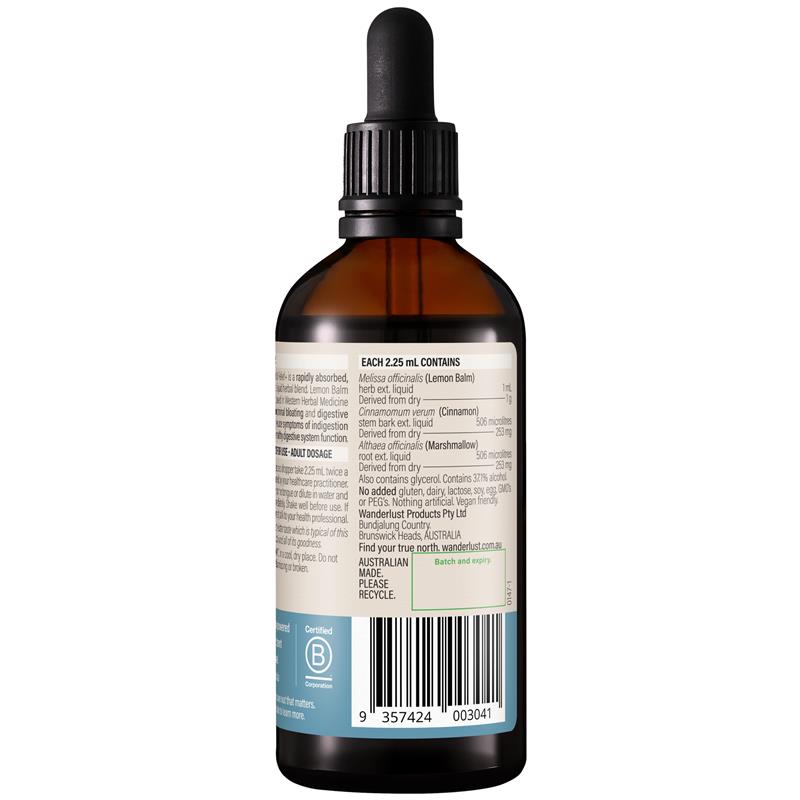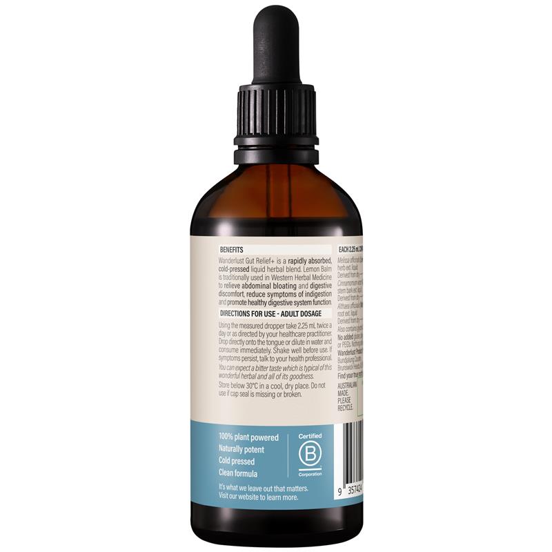 Wanderlust Gut Relief+ 是一款快速吸收的冷榨液体草本混合物。柠檬香蜂草传统上用于西方草药,可缓解腹胀和消化不适,减轻消化不良症状,并促进健康的消化系统功能。
