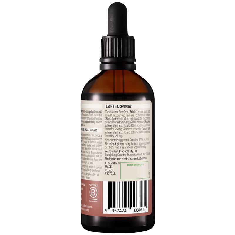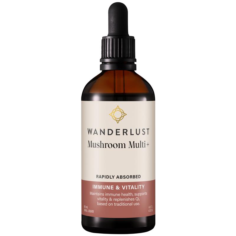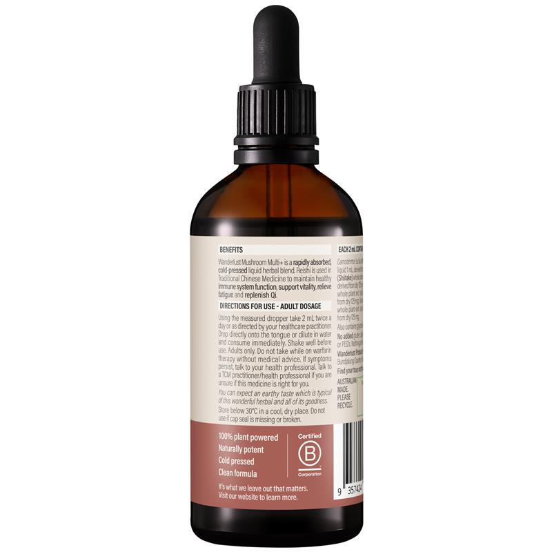Wanderlust Mushroom Multi+ 是一款快速吸收的冷榨液态草本混合物。灵芝在传统中医中用于维持健康的免疫系统功能、增强活力、缓解疲劳和补气。