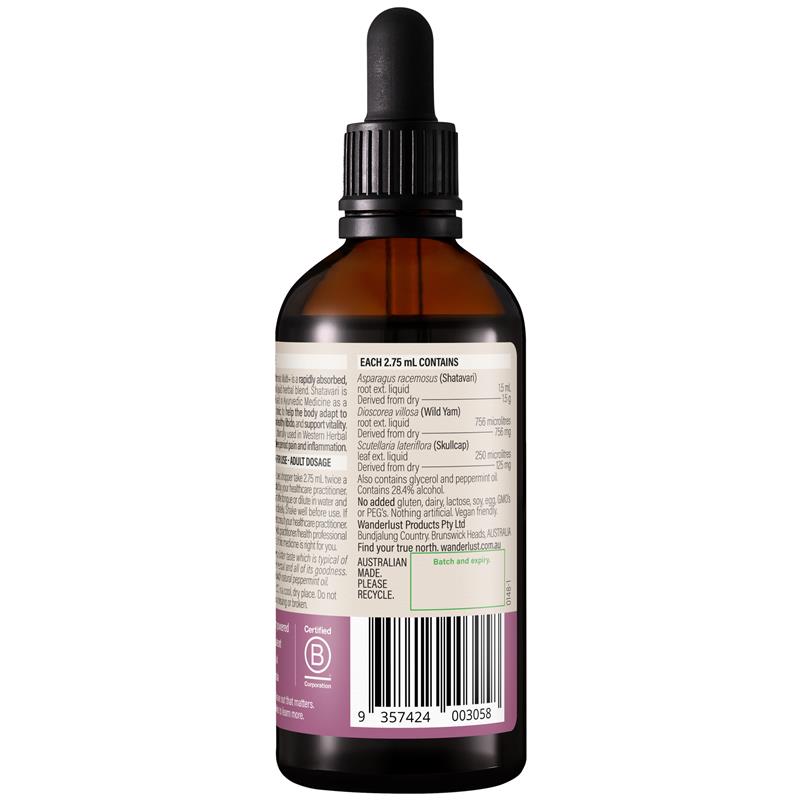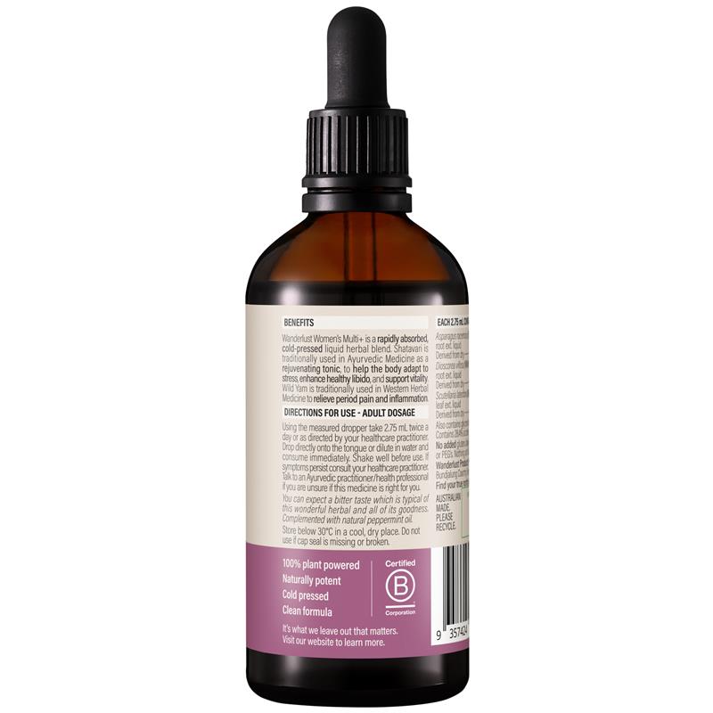 Wanderlust 女士复合维生素+是一款快速吸收的冷榨液体草本混合物。芦荟在阿育吠陀医学中传统上被用作恢复活力的滋补品,帮助身体适应压力,增强性欲,并增强活力。野山药在西方草药中传统上用于缓解痛经和炎症。